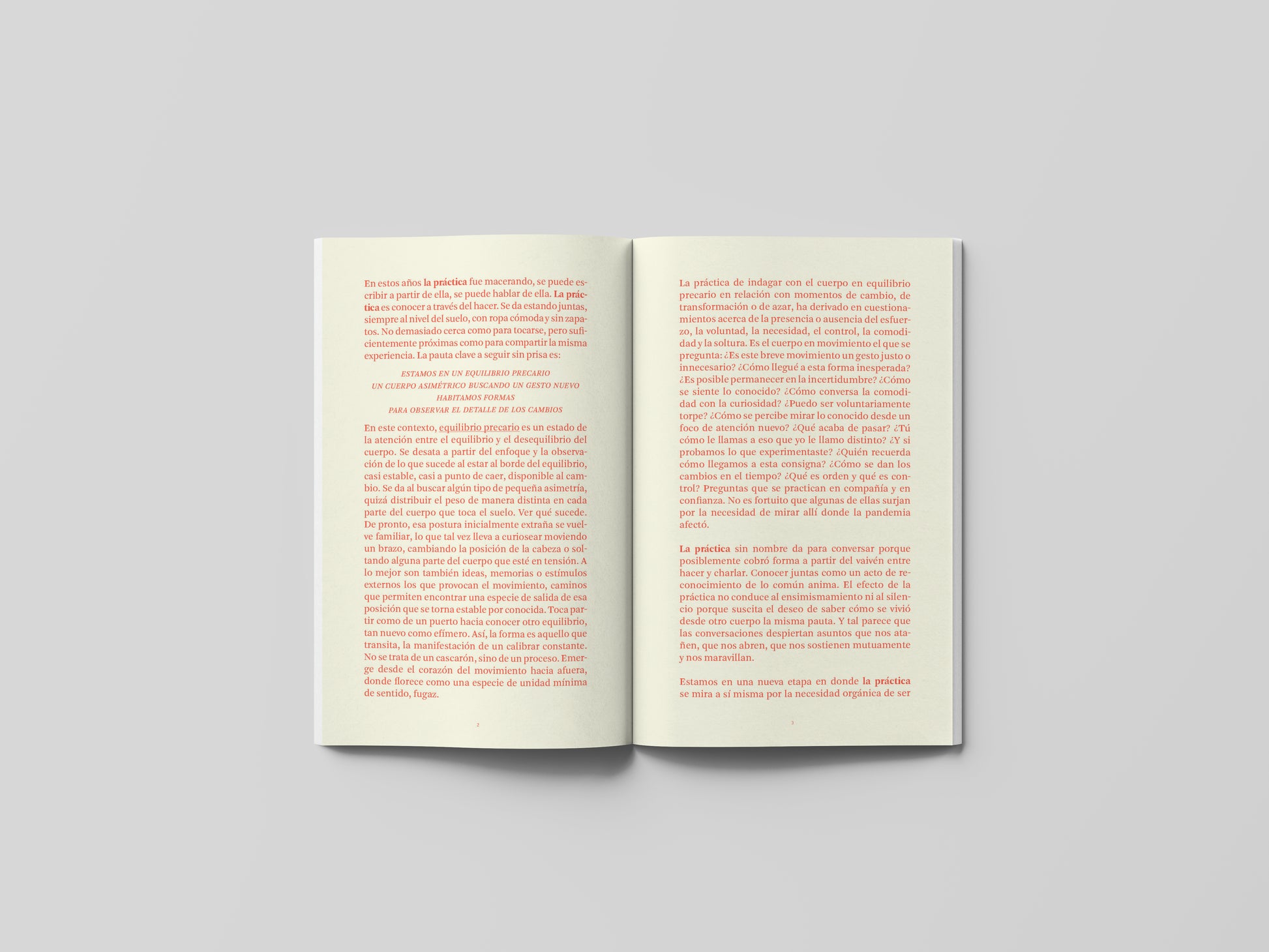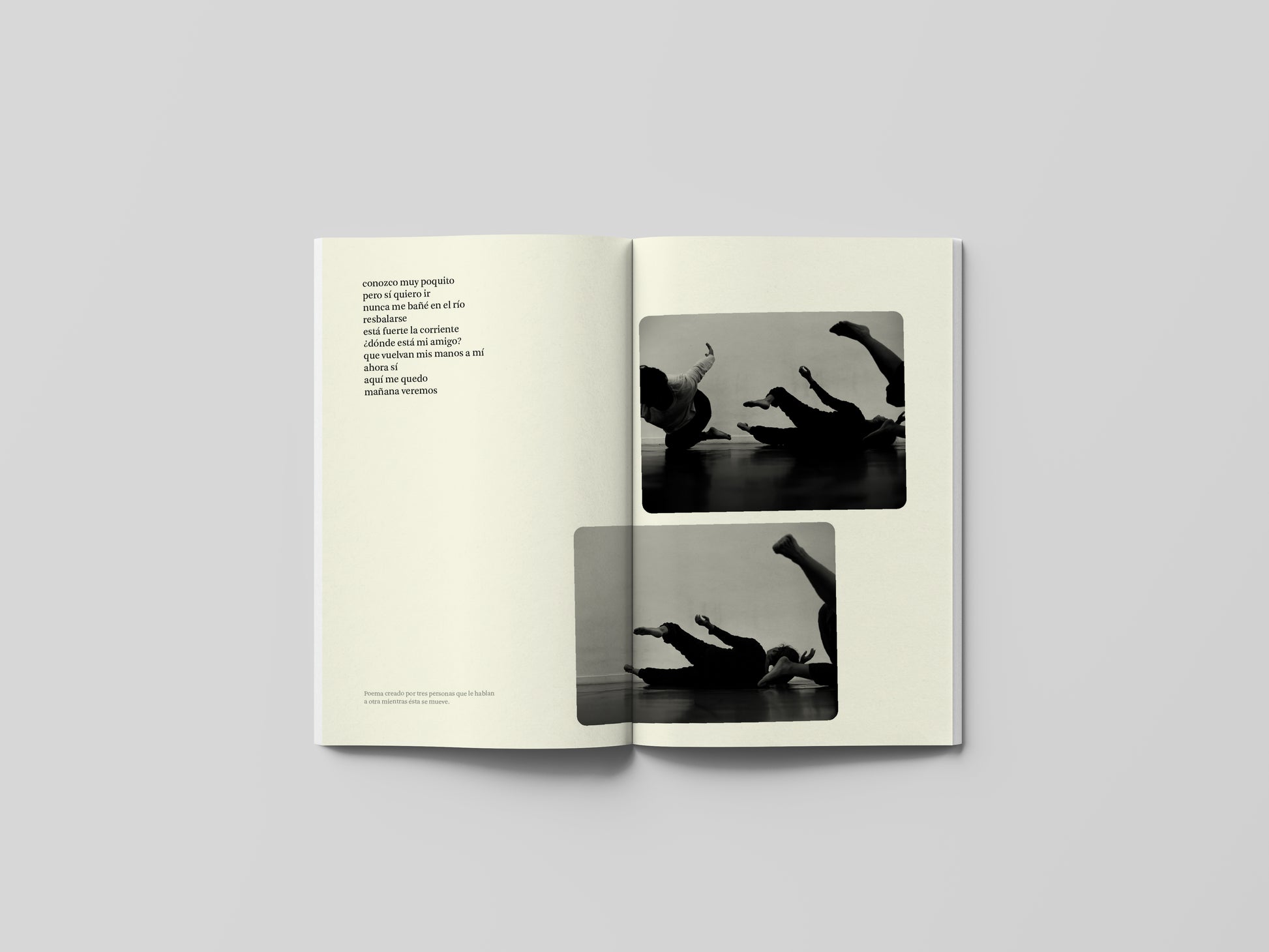 Este libro es el resultado del encuentro entre dos iniciativas: la invitación a Rita Ponce de León (Lima, 1982) a desarrollar un proyecto editorial y, por otro lado, una residencia en Tumbes 204, un centro para la investigación del movimiento en Perú. De la mano, Rita Ponce de León, Joelle Gruenberg, Carola Robles y Mariana De Los Ríos, han desarrollado una práctica sin nombre, un estudio en proceso a partir de saberes en el campo de la danza, el movimiento y la educación somática (campo de estudio que se sirve del cuerpo en movimiento como lugar primario de aprendizaje).